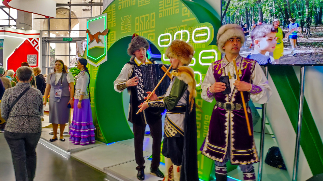 Артисты в национальных костюмах на стенде региона в павильоне №75 ВДНХ