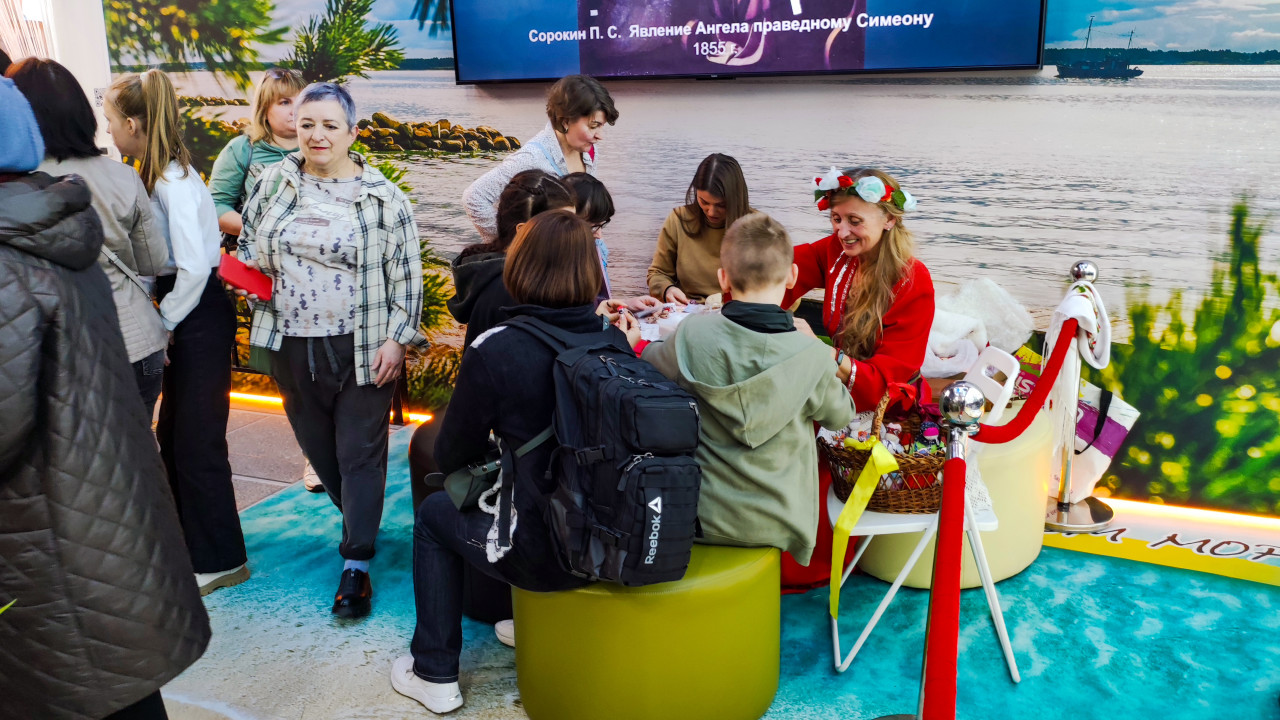 Фотография сделана в павильоне №75 ВДНХ во время международной выставки-форума «Россия». На переднем плане группа детей и взрослых участвует в мастер-классе под руководством девушки в традиционном костюме. Фоном служит крупный экран с изображением водной глади и историческим живописным сюжетом. Этнографическая зона оформлена с акцентом на традиции региона, демонстрируя элементы народного творчества. Снимок подходит для материалов о культурных мероприятиях, народных ремёслах и образовательных программах.