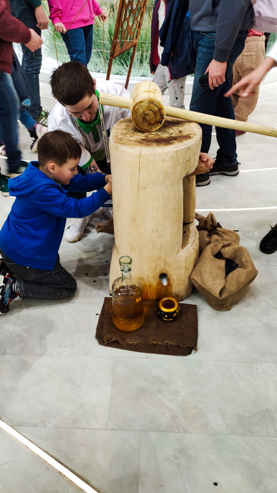 На снимке показана интерактивная зона выставки «Россия» в павильоне №75 ВДНХ 2023–2024 годов, где дети и взрослые участвуют в работе с деревянным прессом, напоминающим устройство для выжимки масла или сока. В нижней части композиции стоит стеклянная бутыль с жидкостью и расписанная кружка, рядом лежат мешки с семенами. Видны участники мероприятия, помогающие детям осваивать механизм. Фото подходит для материалов о семейных мероприятиях, образовательных интерактивах, ремёслах и региональных экспозициях.