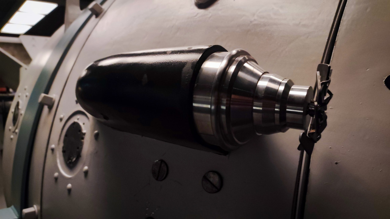 На фото изображён технологический узел макета атомной бомбы РДС-1, сооружённый с высокой детализацией и экспонируемый в павильоне «Атом» на ВДНХ. На переднем плане виден цилиндрический модуль с полированными металлическими элементами и крепёжными узлами, встроенный в корпус изделия. РДС-1 — первая советская плутониевая бомба мощностью 22 килотонны, испытанная 29 августа 1949 года на Семипалатинском полигоне; длина 3,7 м, диаметр 1,5 м, масса 4,6 тонны. Фотография подходит для научно-популярных материалов, посвящённых истории ядерных технологий и инженерным решениям середины XX века.