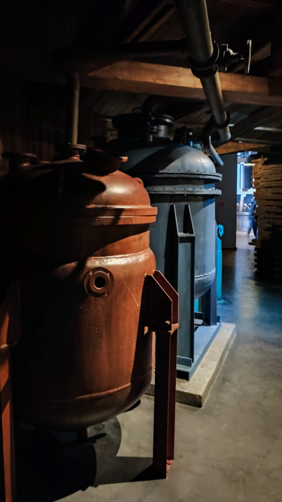На фотографии изображены крупные промышленные ёмкости, установленные в затемнённом секторе экспозиции павильона «АТОМ» на ВДНХ. На переднем плане виден массивный металлический резервуар с выраженной коррозией, рядом расположен более крупный цилиндрический резервуар с трубопроводами и опорными конструкциями. На заднем плане просматривается часть выставочного пространства и проход посетителей. Экспозиция относится к разделу, посвящённому становлению технологической базы атомной отрасли. Кадр может использоваться для материалов об индустриальной истории, инженерных технологиях и музейных экспозициях.