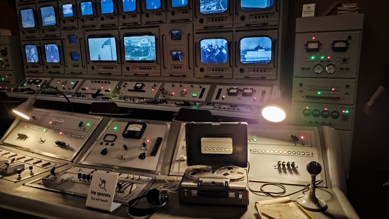 На фото запечатлён пультовый зал, стилизованный под центр управления середины XX века, расположенный внутри исторической зоны павильона «АТОМ» на ВДНХ. В кадре — многорядная панель с экранами, показывающими архивную хронику, многочисленные тумблеры, приборы, лампы-индикаторы, а также стол с катушечным магнитофоном, микрофоном и табличкой «Не трогать». Снимок подходит для материалов о развитии советских систем управления, музейных экспозициях и истории технологий.