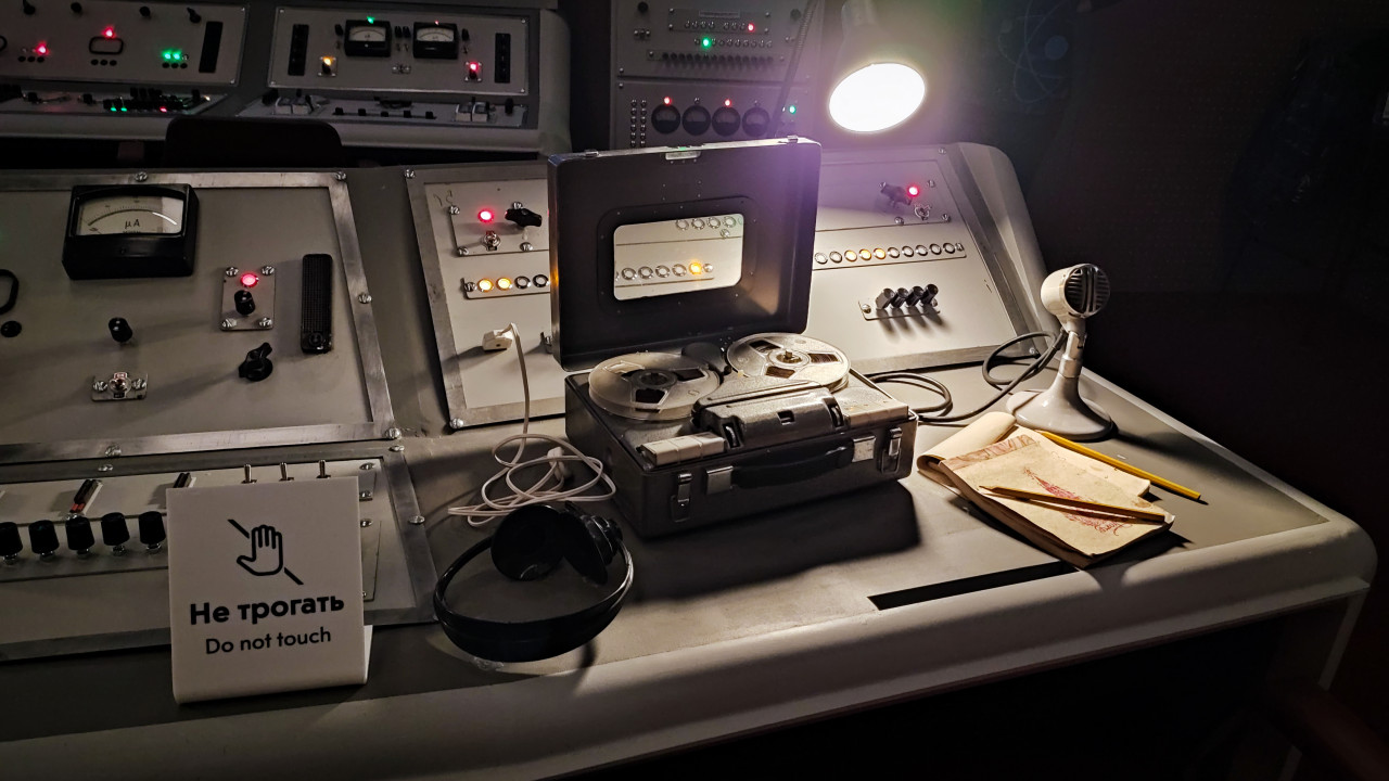 На фото запечатлено рабочее место оператора в пультовой зоне павильона «АТОМ» на ВДНХ, входящей в историческую экспозицию о советском атомном проекте. На переднем плане расположен открытый катушечный магнитофон, рядом находятся наушники, карандаши, блокнот и настольный микрофон. На заднем плане видны элементы ретро-панелей управления с индикаторами, переключателями и измерительными приборами. Снимок подходит для материалов о технике середины XX века, музейных реконструкциях и истории советских систем связи.