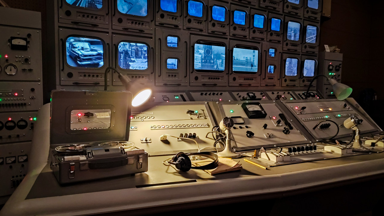 На фото представлена часть пультового центра, оформленного в стиле середины XX века и входящего в экспозицию павильона «АТОМ» на ВДНХ. В кадре видны многочисленные мониторы со старой хроникой, приборные панели с тумблерами, индикаторами, стрелочными измерителями и блоками переключателей. На переднем плане расположены катушечный магнитофон, настольная лампа, наушники, блокнот и микрофон. Сцена отражает типичное рабочее место оператора советского центра управления и может быть использована в публикациях о технической истории, музейных реконструкциях и развитии систем контроля.