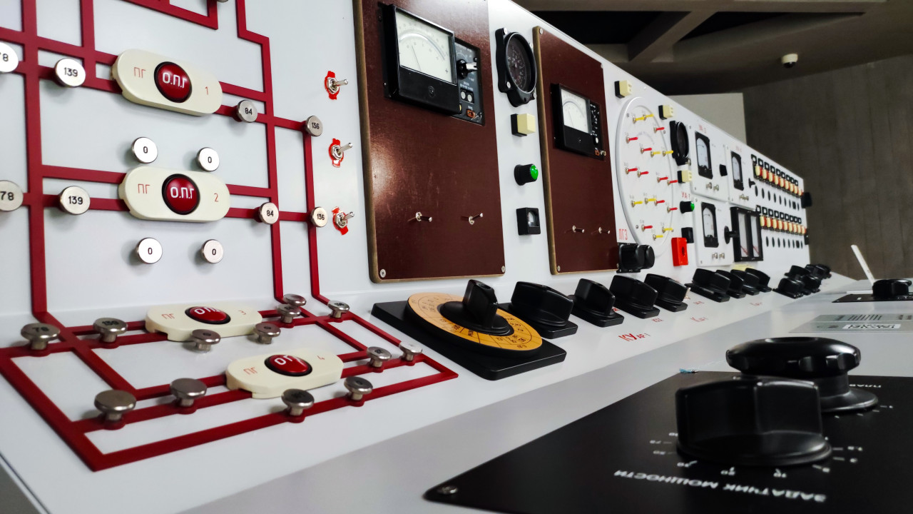 Панель управления с рядами кнопок и индикаторов в экспозиции павильона «АТОМ»