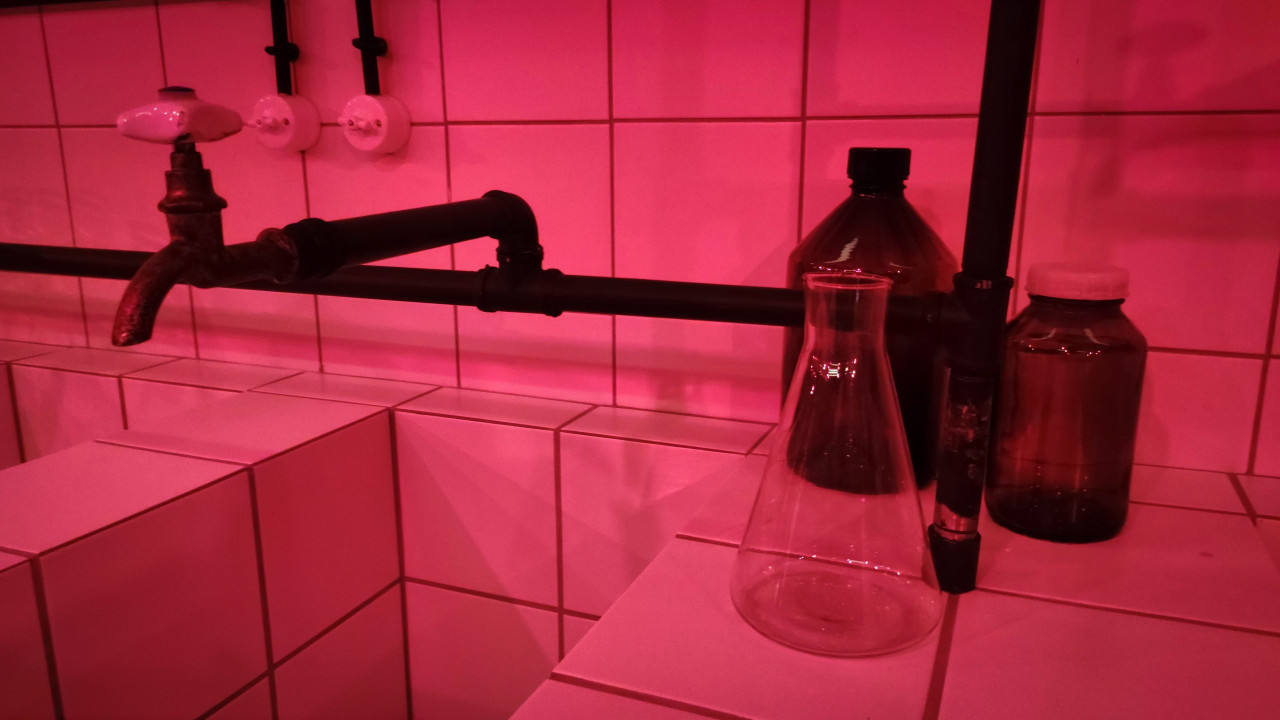 На фото запечатлена часть лабораторной инсталляции павильона «АТОМ» на территории ВДНХ, снятая во время выставки-форума «Россия» 2023–2024 годов. Видны кафельные рабочие поверхности, металлические трубы с кранами старого типа, стеклянная коническая колба и две тёмные химические бутылки. Освещение выполнено в красном спектре, что подчёркивает экспозиционный характер зоны, посвящённой отечественной атомной отрасли. Снимок можно использовать в публикациях о научных экспозициях, лабораторных интерьерах и образовательных проектах.
