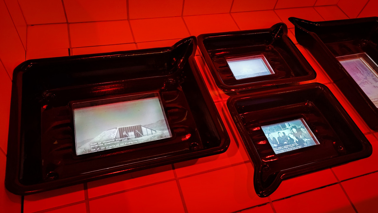 На изображении показаны фотолабораторные кюветы, встроенные в экспозицию павильона «АТОМ» на ВДНХ, наполненные экранами с историческими изображениями и подписями. Видны кадры о ранних этапах развития атомной промышленности, включая объекты 1940-х годов. Яркое красное освещение и кафельная отделка создают атмосферу лабораторного пространства. Снимок сделан во время выставки-форума «Россия» 2023–2024 годов и может использоваться в публикациях о музейных экспозициях, истории науки и визуальных инсталляциях.