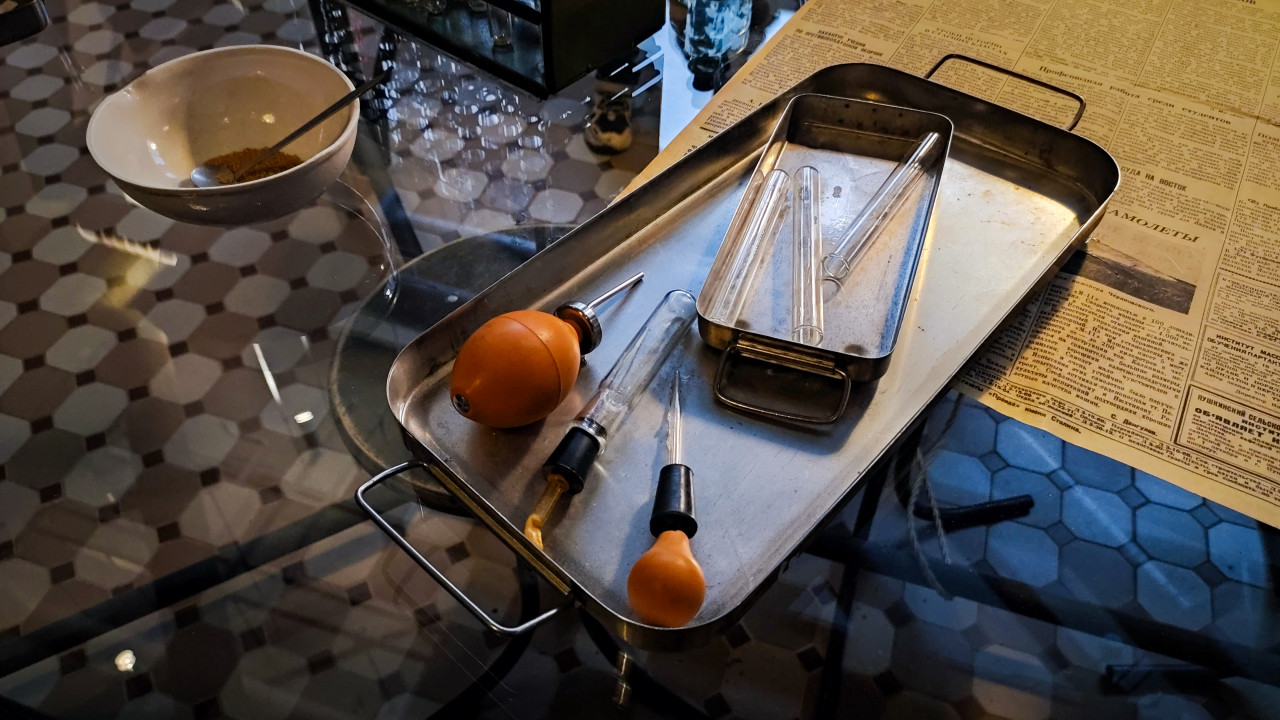 На изображении показан металлический лоток с пипетками, стеклянными трубками и резиновыми грушами, размещённый на столе реконструированной лаборатории павильона «АТОМ» на ВДНХ, снятой во время выставки-форума «Россия» 2023–2024 годов. На заднем плане частично видна миска с порошком и газетные листы, уложенные на поверхность стола, подчеркнувшие стилистику лабораторий середины XX века. Экспозиция демонстрирует инструменты, применявшиеся в научных исследованиях советского периода. Фото подходит для образовательных и исторических материалов о химии и научной работе.