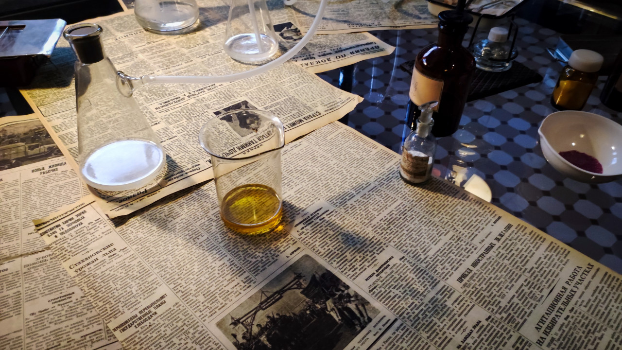 На снимке отображён стол лабораторной реконструкции в исторической зоне павильона «АТОМ» на ВДНХ, снятый во время выставки-форума «Россия» 2023–2024 годов. На поверхности стола лежат листы старых газет, поверх которых размещены колбы различных форм, мерный стакан с жёлтой жидкостью, маленький стеклянный флакон и коричневый аптечный сосуд. Видна часть стеклянной системы с гибкими трубками. Экспозиция демонстрирует рабочую среду научных лабораторий советского периода, связанных с ранними этапами атомного проекта. Фото подходит для публикаций о химии, истории науки и музейных экспозициях.