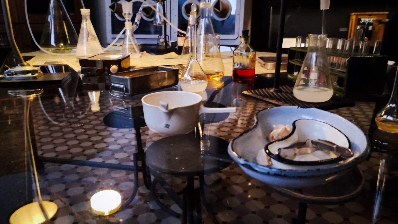 На изображении представлен фрагмент лабораторного стола исторической зоны павильона «АТОМ» на ВДНХ, снятый в период выставки-форума «Россия» 2023–2024 годов. На столе расположены различные колбы, стеклянные реакционные сосуды, металлические лотки, фарфоровые чаши, химические флаконы и элементы трубочной системы. На заднем плане виден герметичный бокс для работы с веществами. Разложенные старые газеты подчёркивают стилистику лабораторий середины XX века и связь экспозиции с ранними этапами отечественного атомного проекта. Фото подходит для научных публикаций и музейных материалов.