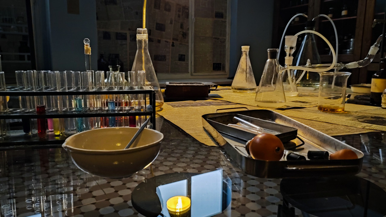 Фотография сделана в зоне «Атомариум» павильона «АТОМ» на территории ВДНХ во время выставки-форума «Россия». На столе размещены лабораторные пипетки, резиновые груши, металлические лотки, колбы и стакан с раствором. Окна, заклеенные газетами, и обилие оборудования отражают исторические этапы атомной науки, представленные в подземных уровнях павильона. Фото подходит для визуального сопровождения материалов о демонстрации химических процессов, музейных экспозиций и научного образования.