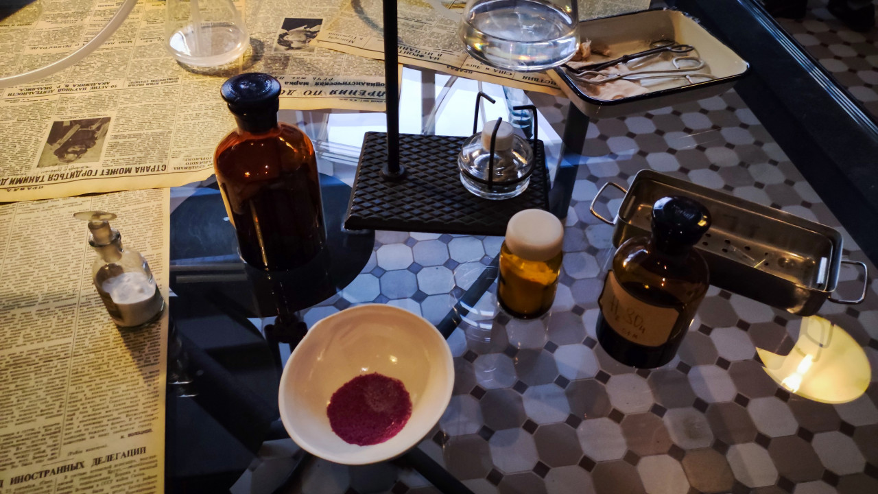 Фотография снята в рамках выставки-форума «Россия» в павильоне «АТОМ» на ВДНХ. В кадре — стеклянные бутылки с реактивами, металлические лотки, лабораторная лампа, а на столе — миска с порошком. Экспозиция объединяет элементы, характерные для лабораторных работ XX века, с современной интерактивной подачей, демонстрируя развитие атомной науки. Фото подходит для использования в научно-популярных проектах, образовательных материалах и публикациях о выставках.
