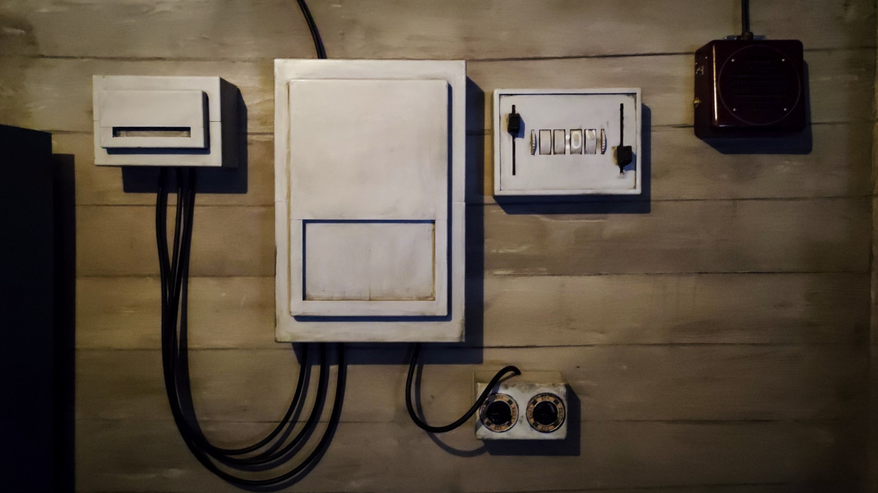 На изображении показаны элементы электротехнического оформления исторической зоны павильона «АТОМ» на ВДНХ: распределительные коробки, кабельные линии и панель с переключателями. Фото сделано во время выставки-форума «Россия». Экспозиция стилизована под помещения середины XX века, отражающие атмосферу рабочих зон советского атомного проекта. Кадр можно применять в материалах о музейных инсталляциях, технической истории и визуализации инженерных систем.