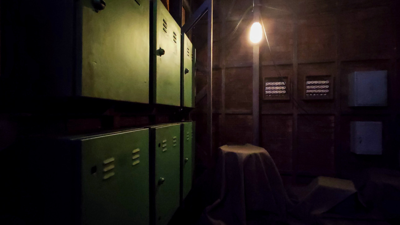 На фото изображено затемнённое техническое помещение павильона «АТОМ» на ВДНХ, входящее в историческую часть экспозиции выставки-форума «Россия». Слева размещены зелёные металлические шкафы, справа видны две панели с керамическими изоляторами и закрытый распределительный щит. В центре кадра свисает одиночная лампа, создающая атмосферу рабочей зоны середины XX века. Помещение стилизовано под инженерный участок, связанный с обслуживанием инфраструктуры ранних этапов атомной промышленности. Снимок подходит для материалов об электрооборудовании, музейных выставках и индустриальной тематике.
