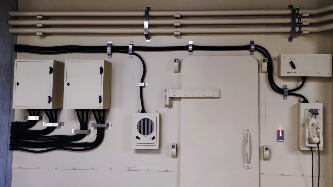 На изображении показана стена с электротехническими шкафами, кабельными жгутами и вентиляционным блоком в павильоне «АТОМ» на ВДНХ, открытому для посетителей в ноябре 2023 года в рамках выставки-форума «Россия». Видна массивная дверь, элементы крепления и аккуратно проложенные линии проводки, демонстрирующие устройство инженерной инфраструктуры объектов атомной промышленности. Фото подходит для статей о технологическом устройстве энергетических комплексов и экспозициях научно-промышленного направления.