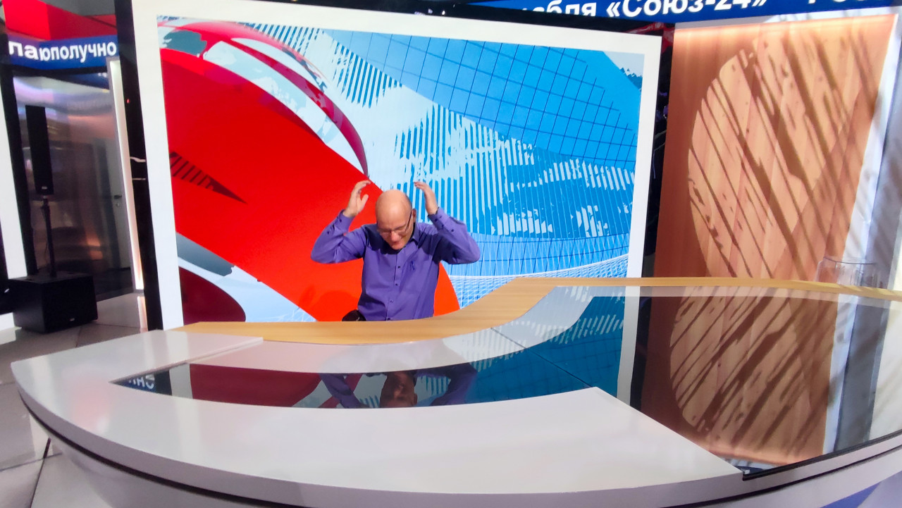 На снимке посетитель с жестом поднятых рук находится за изогнутым новостным столом демонстрационной студии в павильоне №75 ВДНХ, где проводилась выставка-форум «Россия». Фон составляет большой LED-экран с динамичной красно-синей графикой, выполненной в стиле информационных телеканалов. Справа и слева видны элементы стендов, отражения на стеклянной поверхности стола и часть оборудования. Фото можно использовать для публикаций о телевизионных форматах, интерактивных экспозициях и медиаобразовательных пространствах.
