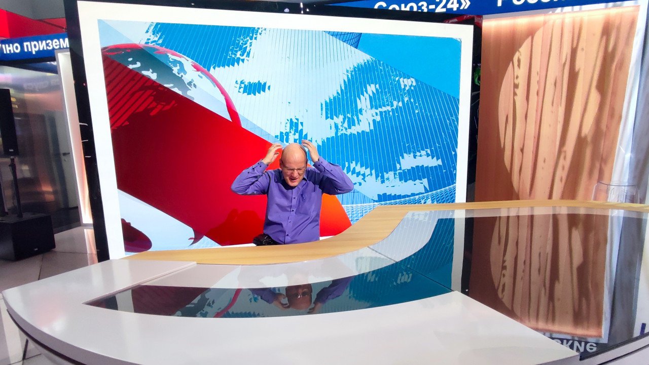 Мужчина у новостного стола демонстрационной зоны телестудии ВДНХ