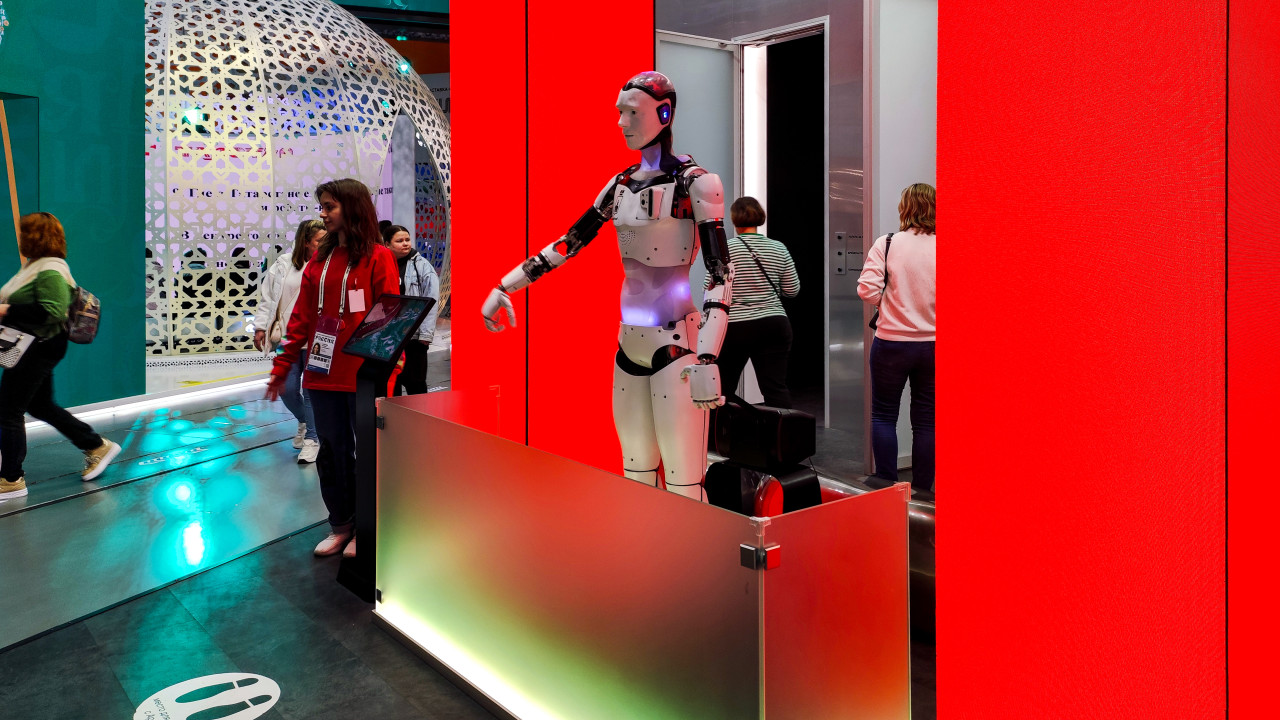Гуманоидный робот на стенде с цифровыми панелями на выставке «Россия»