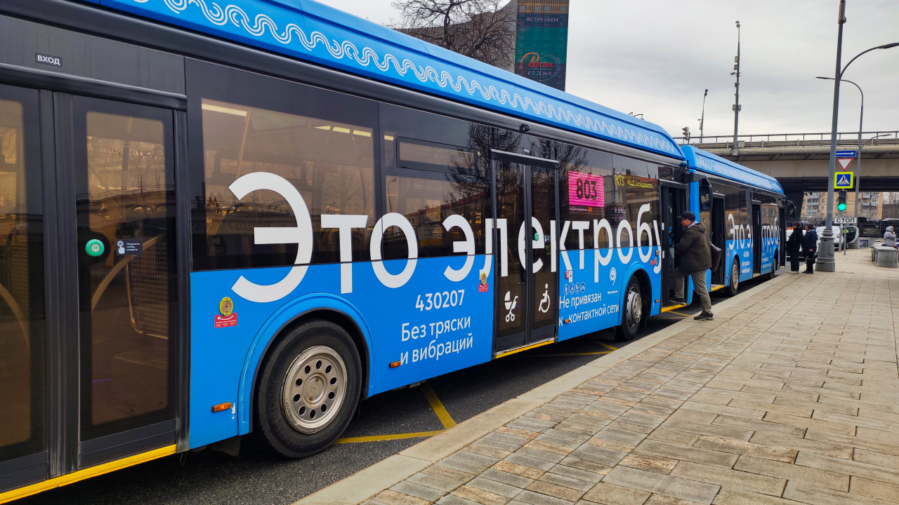 Электробус маршрута 803 на остановке в Москве