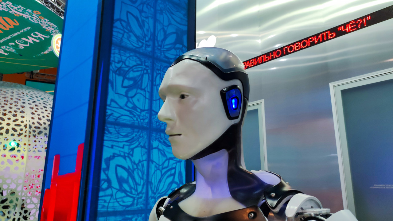 На фото изображён гуманоидный робот с подсветкой в области головы и корпуса, представленный на технологическом стенде павильона №75 ВДНХ во время выставки-форума «Россия». В кадре заметны элементы оформления стенда — декоративная панель с узорами и бегущая строка с текстом. Робот демонстрирует современные достижения в области робототехники и инженерных решений. Снимок подходит для материалов о технических выставках, инновациях и научно-популярных проектах.