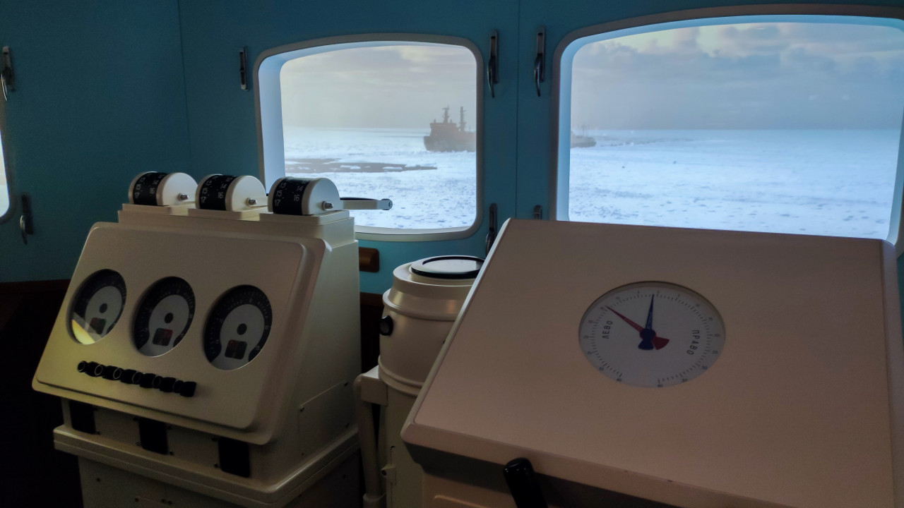 На изображении запечатлена часть интерьерной инсталляции, стилизованной под рубку атомного ледокола, расположенной в павильоне «Атом» на ВДНХ в период выставки-форума «Россия» 2023–2024 годов. На переднем плане видны блоки навигационных приборов, шкалы, рычаги управления и элементы корпуса оборудования. Через окна демонстрируется проекция арктического ледового поля и силуэты судов, имитирующая реальный вид с мостика. Экспозиция связана с историей атомного флота СССР, включая ледокол «Ленин» — первое в мире надводное судно с ядерной установкой, созданное для проводки караванов по Северному морскому пути. Снимок подходит для публикаций о навигации, судовождении и музейных экспозициях.