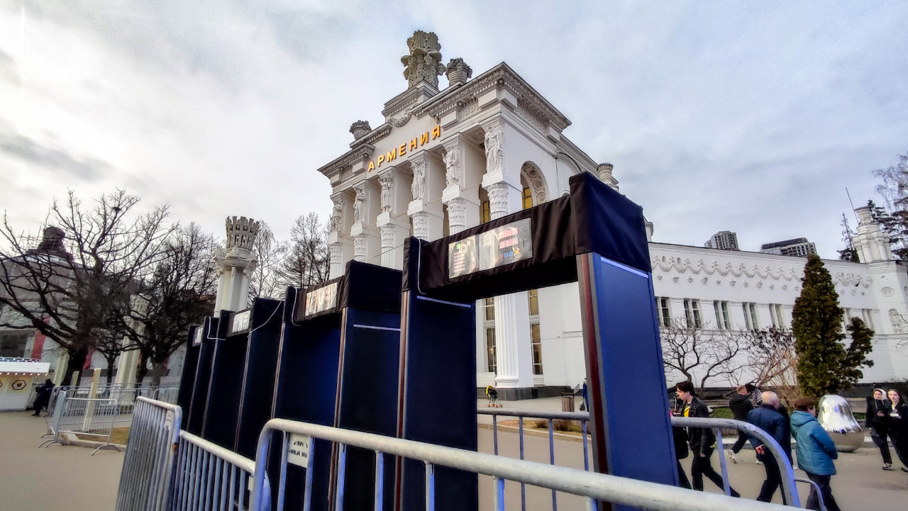 вднх архитектура историческое здание культурное наследие фасад москва выставочный комплекс городской пейзаж ВДНХ павильон Армения сталинский ампир колонны скульптуры СССР Москва декор металлодетекторы ограждения посетители контроль доступа общественная территория выставочный центр городской ландшафт инфраструктура туристический объект 1954 архитектурный памятник прогулка улица защитные конструкции массовые мероприятияПохожие фотографии