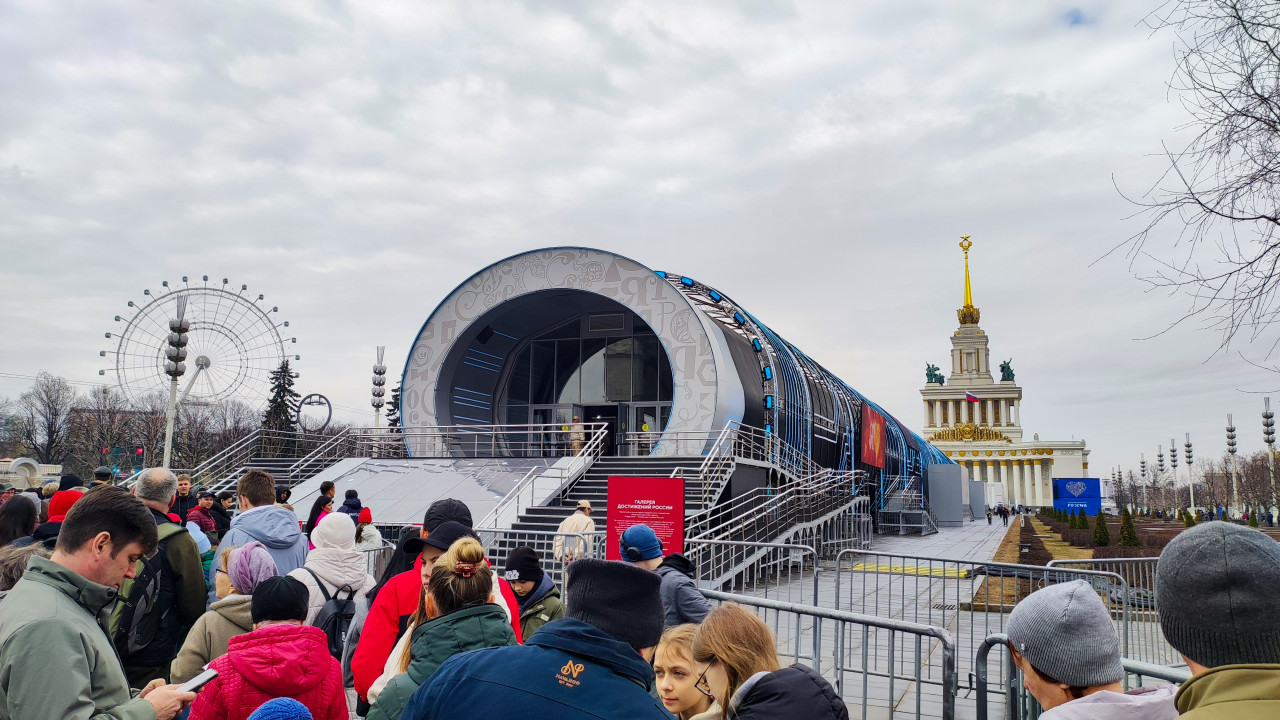 вднх москва выставка россия архитектура павильон общественное пространство городской пейзаж посетители экспозиция культурное событие инфраструктура массовое мероприятие входная зона современная конструкция городской объект Москва ВДНХ галерея Достижения России павильон А выставка Россия 2023 2024 коллайдер достижений очередь люди мероприятие тоннель достижения культура Главный павильон сталинский ампир СССР туризм городской парк выставочный центр событие форум посещение путеводитель городская средаПохожие фотографии