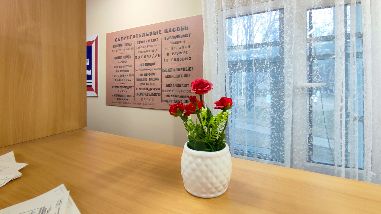 На снимке показана часть интерьерной зоны выставки, где размещён крупный информационный плакат с текстом о работе сберегательных касс СССР, включая правила вкладов, процентов и расчётов. На переднем плане стоит стол с белой вазой и искусственными красными цветами, а справа виднеется окно с лёгкой занавеской. Композиция передаёт атмосферу советских учреждений, характерных для второй половины XX века. Фото подходит для материалов по финансовой истории и музейным реконструкциям.