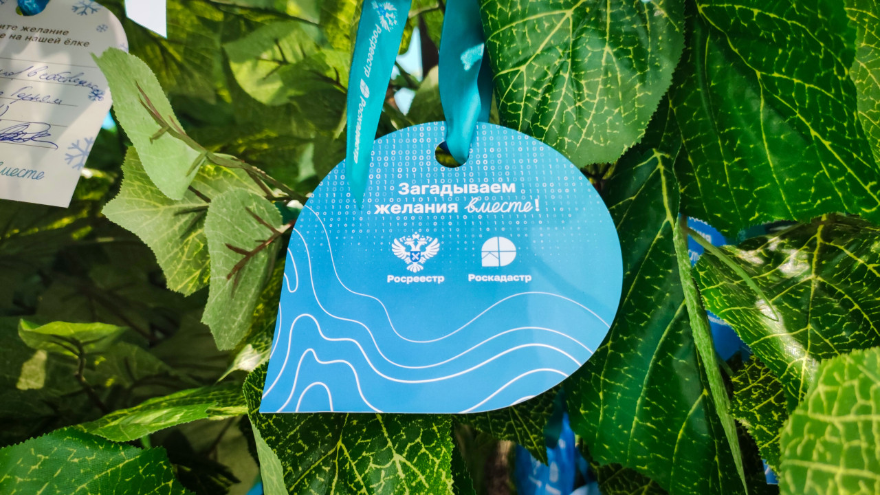 Фотография показывает крупный план фирменной бирки от Росреестра и «Роскадастра», подвешенной на декоративное дерево в экспозиции «Строим будущее» на ВДНХ в 2024 году. Карточка выполнена в голубой гамме и украшена линиями рельефа и цифровым узором. Вокруг видны искусственные листья, создающие атмосферу тематической зоны, посвящённой взаимодействию с посетителями. Снимок подходит для иллюстраций о брендировании, интерактивных форматах участия и оформлении выставочных пространств.