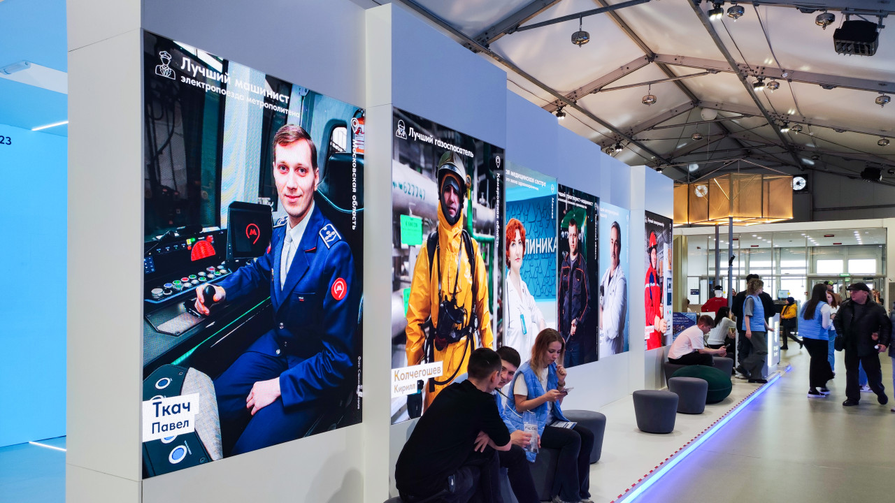 На фото изображена зона павильона экспозиции «На службе здоровья!» Министерства здравоохранения РФ на выставке-форуме «Россия» (ВДНХ, 2024), где размещена серия вертикальных экранов с портретами работников разных профессий: машиниста электропоезда, газоспасателя, медицинских специалистов и представителей других отраслей. Перед стендом сидят посетители, часть которых взаимодействует с экспозицией. Пространство оформлено в современном стиле с использованием световых решений и мультимедийных панелей. Снимок подходит для материалов о кадровой политике, профессиональных сообществах, выставочных проектах и национальных инициативах.