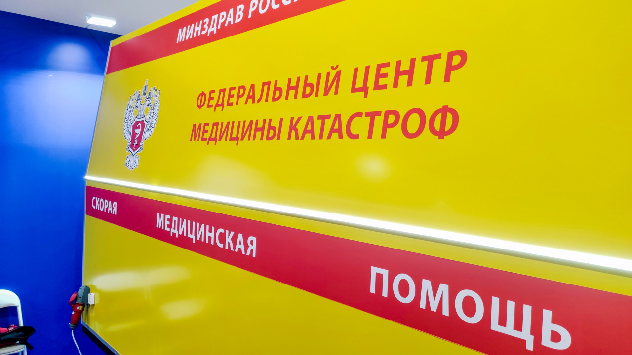 На фотографии изображён ярко оформленный стенд Федерального центра медицины катастроф Минздрава России, представленный на экспозиции «На службе здоровья!» 2024 года на ВДНХ. Жёлто-краская панель с официальной символикой подчеркивает принадлежность к службе экстренной медицинской помощи, рядом размещены элементы оборудования. Снимок отражает участие специализированных служб в публичных медицинских мероприятиях. Фото подходит для тем о медицине катастроф, работе экстренных служб и презентациях ведомственных подразделений.