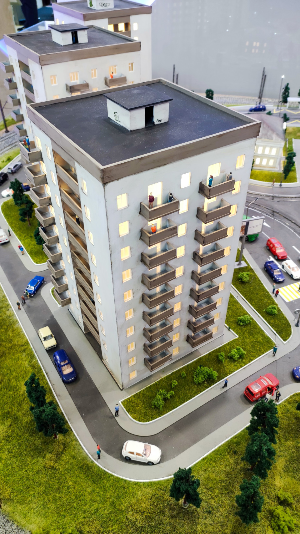 На изображении показан крупный фрагмент макета жилого квартала, созданного для экспозиции «Россия в движении» / «Транспорт России» в павильоне №15 ВДНХ. В центре — многоэтажный дом с балконами и освещёнными окнами. Внизу расположены миниатюрные дороги, автомобили, зелёные участки и фигурки людей. Макет демонстрирует особенности современной городской застройки и внутридворовой инфраструктуры. Снимок подходит для публикаций о моделировании городской среды, архитектурных концепциях и проектах градостроительства.