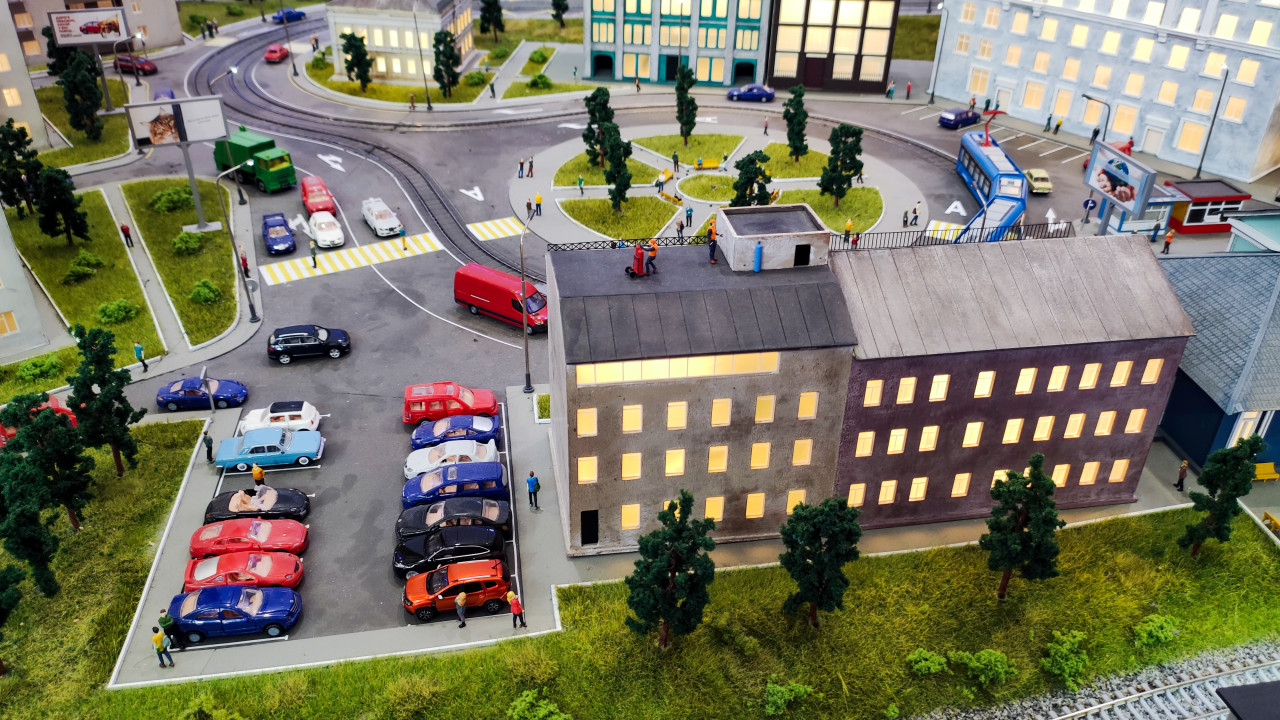 Парковка, трамвайные пути и административное здание на выставочном макете