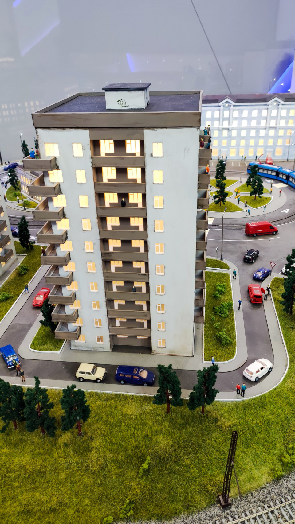 На снимке изображён детализированный макет жилого квартала, представленный в павильоне №15 ВДНХ на выставке «Россия». В центре расположен многоэтажный дом с балконами и освещёнными окнами. По периметру проходят внутридворовые дороги с припаркованными автомобилями, заметны миниатюрные фигуры людей и зелёные зоны. На заднем плане видны трамвайные пути, дорожная разметка и здания административного назначения. Снимок подходит для использования в материалах о градостроительстве, моделировании и экспозиционных проектах.