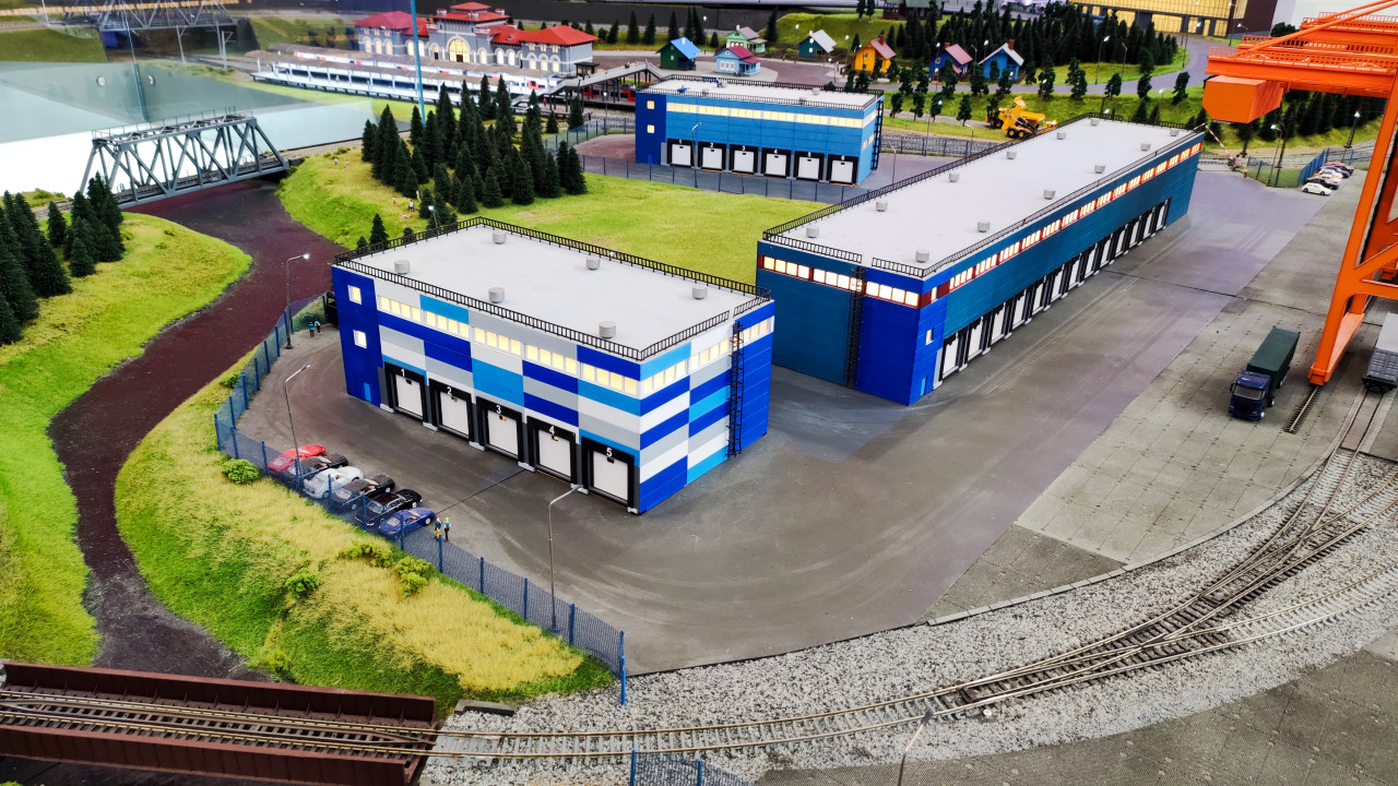 Производственно-складские здания и железнодорожные пути на масштабном макете