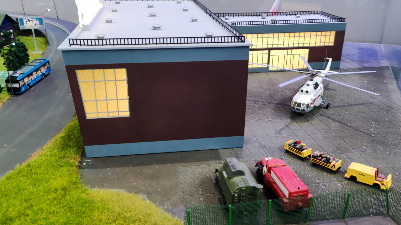 Фотография показывает детализированный участок авиационного макета, снятого на выставке «Россия» в павильоне №15 ВДНХ. В центре кадра расположена модель вертолёта Ми-8, рядом находятся багажные тележки, служебный автомобиль и противопожарная машина. На заднем плане видны здания аэропортовой инфраструктуры и проезжающий пассажирский автобус. Экспозиция создана для демонстрации работы наземных служб аэропорта и взаимодействия различных видов транспорта. Снимок подходит для материалов о вертолётной авиации, логистике и моделировании аэропортовых процессов.
