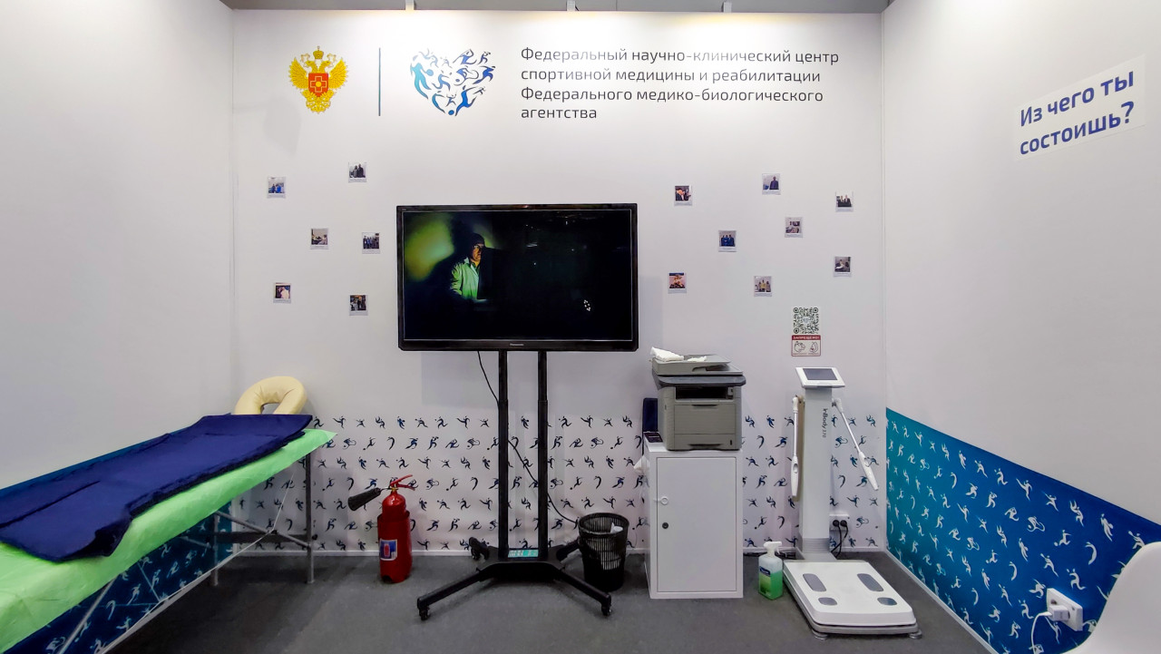 На изображении представлено помещение стенда ФМБА России, где размещены медицинская кушетка, экран с видеоматериалом, весоизмерительное оборудование, принтер и элементы демонстрации спортивной медицины. Фотография сделана на выставке-форуме «Россия» на ВДНХ в 2023–2024 годах. Видны брендированные стены с логотипами ведомства и небольшие фотоматериалы. Фото подходит для публикаций о медицинском оборудовании, спортивной реабилитации и выставочных презентациях.