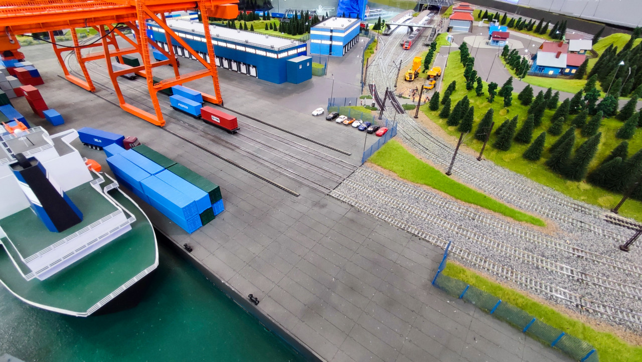 Макет портовой зоны с железнодорожными путями и грузовыми контейнерами