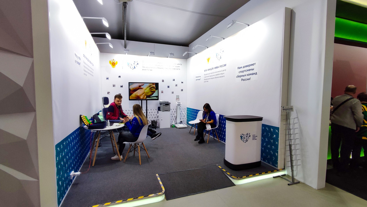 На фото изображён стенд Федерального медико-биологического агентства России, представленный на выставке-форуме «Россия» на ВДНХ. В помещении расположены рабочие места сотрудников, стулья для посетителей, медицинское оборудование и экран, демонстрирующий материалы центра. На стенах размещены информационные надписи о деятельности ведомства. Снимок подойдёт для материалов о медицинских сервисах, спортивной медицине и участии ФМБА в выставочных проектах.