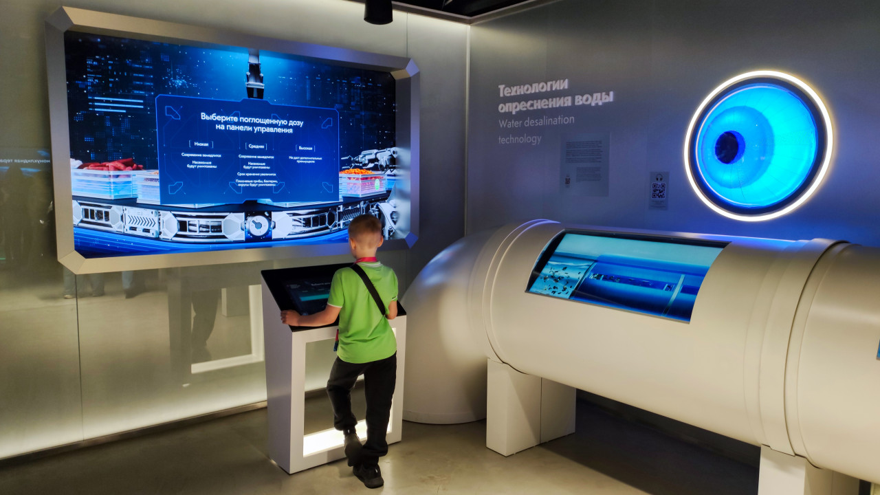 На снимке представлена расширенная зона экспозиции «Технологии опреснения воды» в павильоне «Атом» на ВДНХ, где ребёнок использует сенсорный экран для управления образовательной симуляцией. На большом дисплее отображена схема технологического процесса, включая визуализацию транспортировки материалов. Справа расположен цилиндрический макет секции установки и световой арт-объект круглой формы. Фото подходит для публикаций о водных ресурсах, инженерных решениях, образовательных событиях и демонстрации современных промышленных технологий.