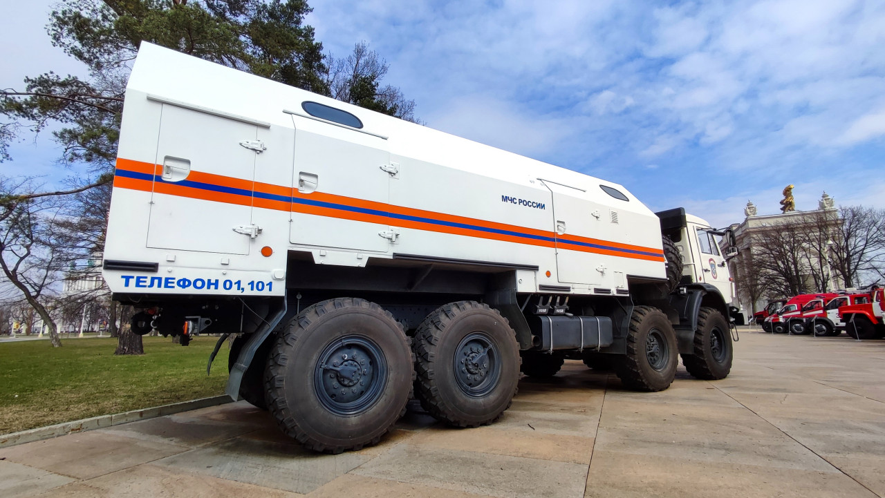На фото изображён крупный вездеходный спецавтомобиль МЧС России, сфотографированный сбоку на выставочной площадке ВДНХ. Видны большие колёса, корпус с окошками, фирменные полосы ведомства и запасное колесо в задней части. На дальнем плане расположен один из павильонов ВДНХ с характерной архитектурой середины XX века и позолоченной скульптурой на крыше, являющийся частью исторического комплекса. Справа находятся пожарные машины, участвующие в экспозиции. Кадр можно применять в материалах о пожарных службах, спасательной технике и городских выставках.