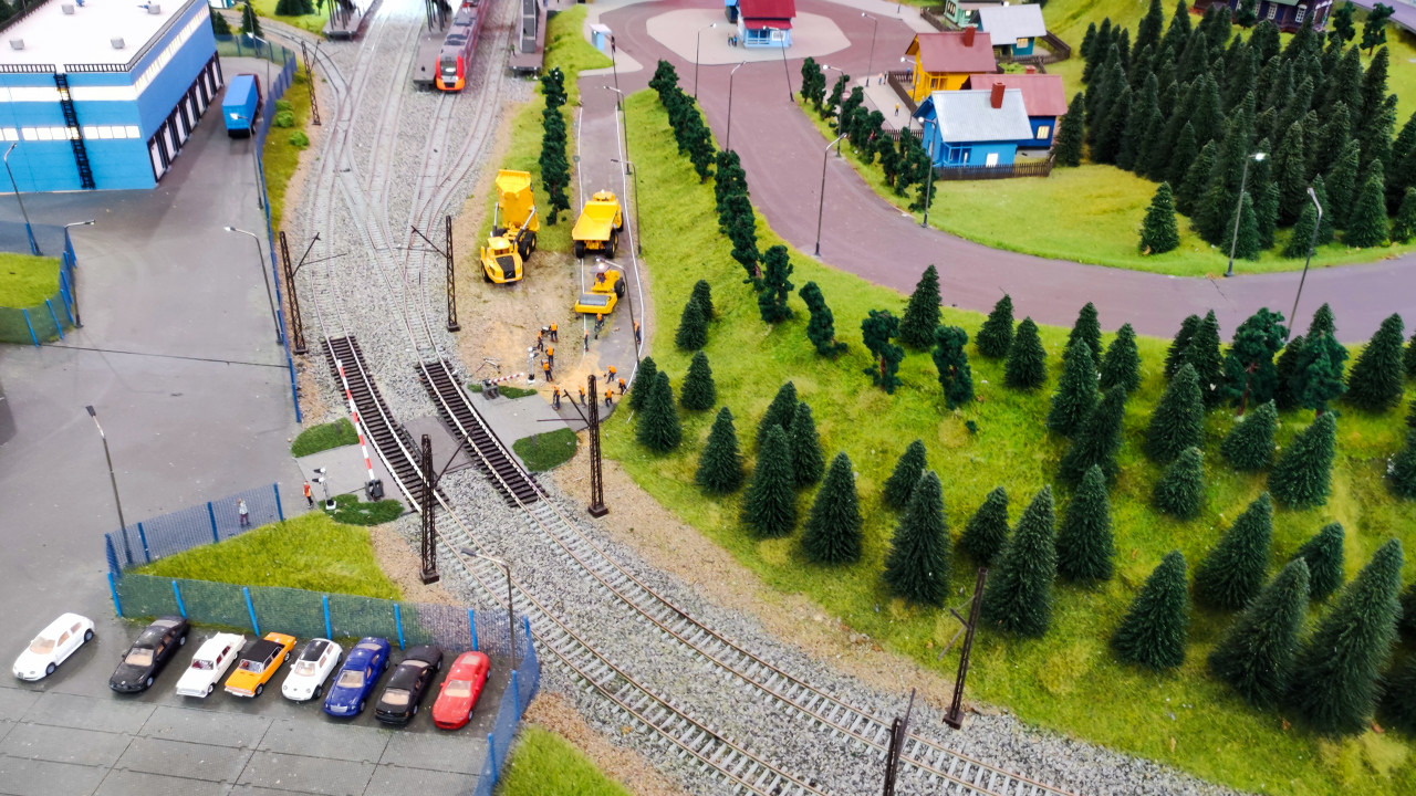 Макет строительной зоны вдоль железнодорожных путей с рабочими и техникой