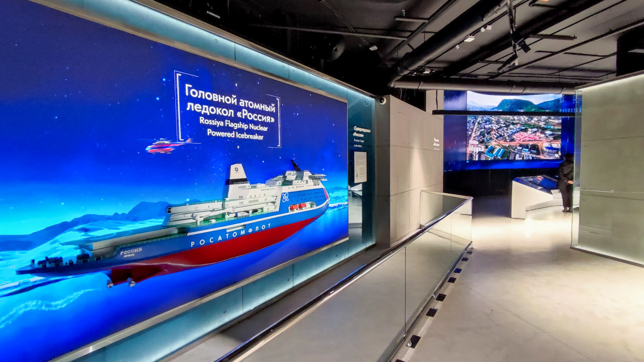 На фото изображён широкий вид павильона «Атом» на ВДНХ, где представлена мультимедийная панель с изображением флагманского атомного ледокола «Россия». Видны стены экспозиционного пространства, декоративные элементы и посетители. Надпись на экране сообщает о принадлежности проекта к Росатомфлоту. Эта зона служит для демонстрации возможностей современных атомных судов и роли атомной отрасли в развитии арктических маршрутов, являясь частью научно-просветительского комплекса выставки-форума «Россия».