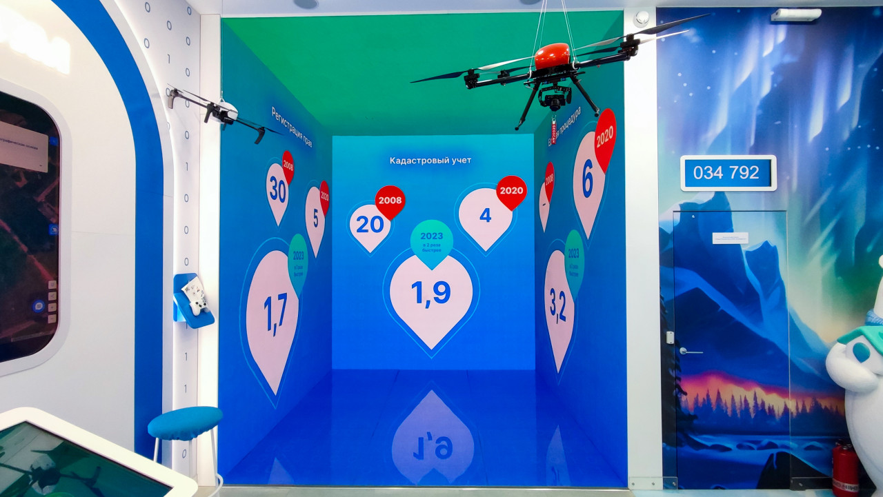 На фотографии запечатлена часть выставочной зоны Росреестра в павильоне №15 «Строим будущее» на ВДНХ, созданной для демонстрации текущих и перспективных проектов ведомства. В центре показан интерактивный стенд с крупными цифровыми метками, отражающими статистику кадастрового учёта за разные годы. Над площадкой закреплён беспилотник, используемый как демонстрационный элемент технологий съёмки. Справа видна декоративная панель с изображением северного пейзажа. Кадр подходит для материалов о цифровых сервисах, геоданных и выставочных технологиях.