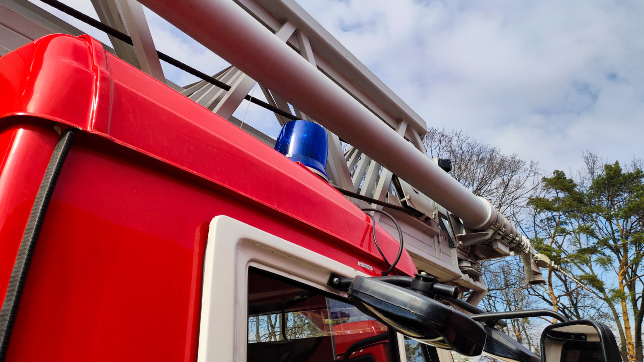 Фото демонстрирует фрагмент кабины пожарной автолестницы АЛ-50 с установленной сверху металлической секцией лестничного подъёма. В кадре видны красный кузов, синий проблесковый маяк, наружное зеркало и элементы конструкции подъёмного механизма. Снимок сделан на выставке «Технологии спасения» на ВДНХ в 2024 году, где была представлена специализированная техника МЧС России. Изображение может использоваться в материалах о пожарно-спасательной технике, инженерных системах и конструкции автолестниц.