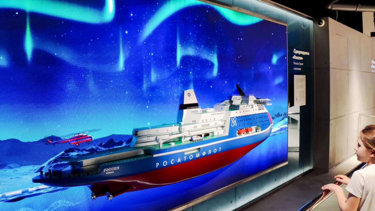 На изображении показана мультимедийная стеновая инсталляция с визуализацией перспективного атомного ледокола «Россия», разрабатываемого для арктического флота. На экране отображены корпус судна, элементы надстройки и северное сияние на фоне полярного пейзажа. Перед экраном стоит посетитель, что подчёркивает масштаб экспозиции. Инсталляция размещена в павильоне «Атом» на ВДНХ и используется для демонстрации современных проектов Росатомфлота и возможностей атомных судов в обеспечении круглогодичной северной навигации.