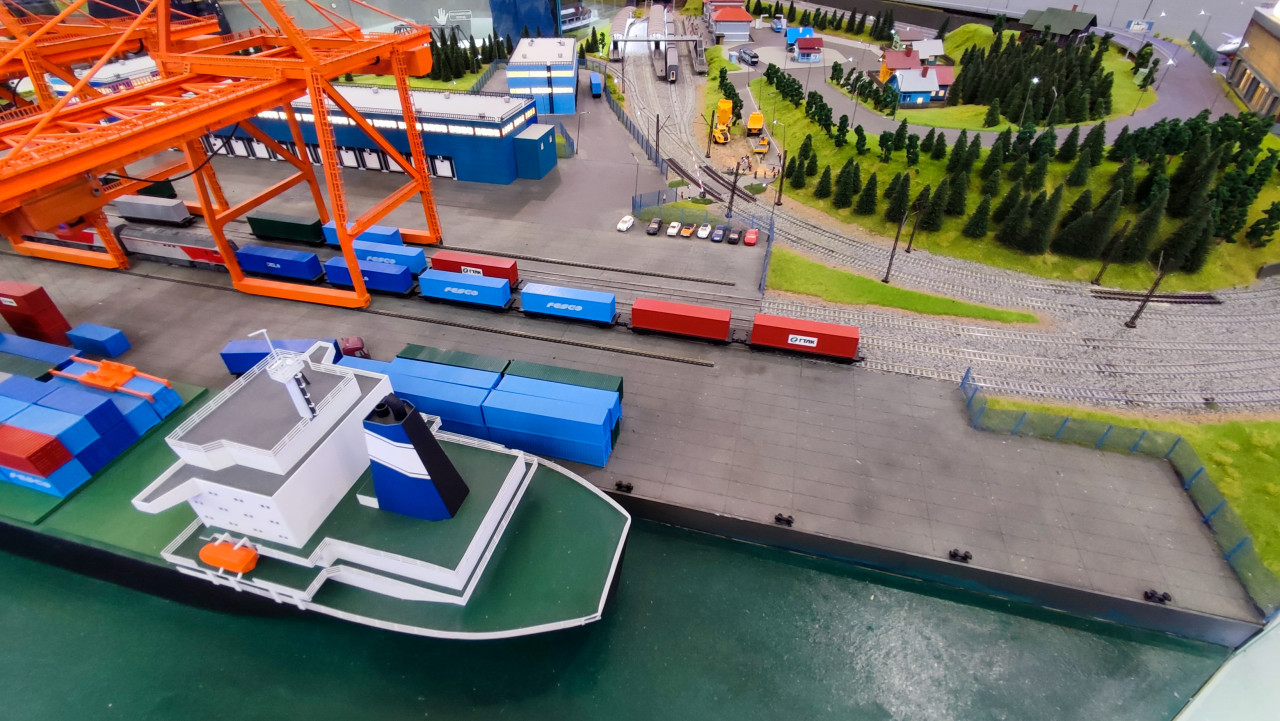 Макет морского терминала с контейнеровозом и железнодорожными платформами
