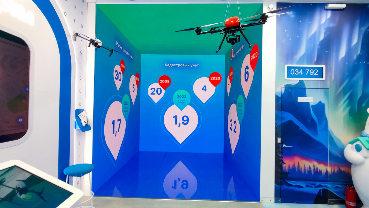 На изображении представлена часть экспозиции Росреестра в павильоне «Строим будущее» на ВДНХ, где отображена статистика кадастрового учёта за 2008, 2020 и 2023 годы. Центральная панель окружена боковыми экранами с данными о регистрации прав и связанных процедурах. Над пространством установлен демонстрационный дрон, символизирующий современные методы сбора геоданных. Справа видна декоративная панель с изображением северного пейзажа. Фото можно использовать в материалах о государственном учёте недвижимости, цифровизации и ведомственных выставках.