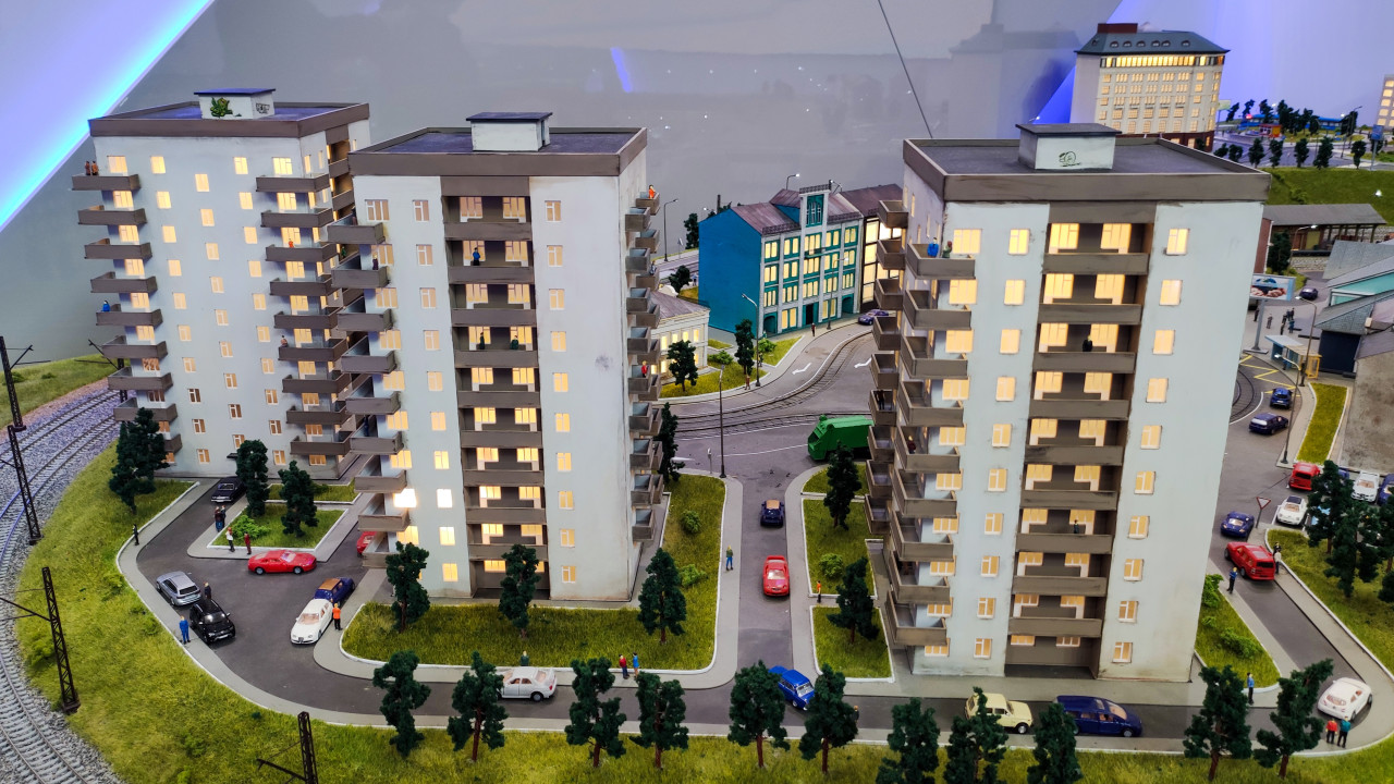 На изображении представлен участок городского макета, демонстрируемого в павильоне №15 ВДНХ на выставке «Россия». На переднем плане расположены рельсы железнодорожной линии, за которыми начинается зелёная зона с деревьями, ведущая к трём многоэтажным жилым корпусам с балконами и подсвеченными окнами. Между домами проходят автомобильные дороги с припаркованными машинами и пешеходами. В глубине виден трамвайный состав, движущийся по изогнутой линии городского маршрута. Макет демонстрировал особенности городской транспортной сети и архитектурной застройки. Фотография подходит для материалов об урбанистике и моделировании.