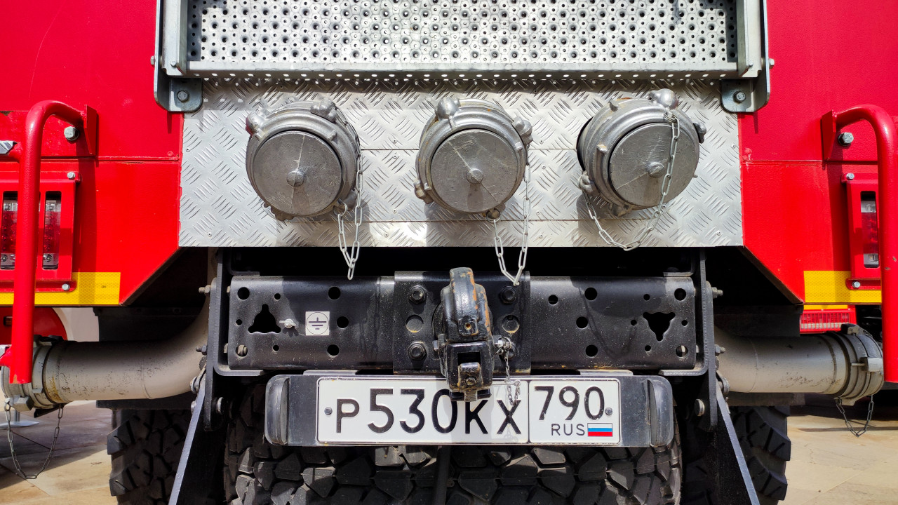 На изображении показан фрагмент задней части пожарного автомобиля, экспонировавшегося на выставке «МЧС России. Технологии спасения» на ВДНХ в 2024 году. В центре кадра расположены три закрытых металлических патрубка, закреплённых цепочками, предназначенных для подключения пожарных рукавов. Ниже видна буксировочная сцепка и регистрационный номер. В кадр попадают элементы шасси, рама, входящие трубы и фрагменты задних фонарей. Снимок подходит для материалов о конструкции пожарных машин, особенностях их оснащения и работе аварийных служб.